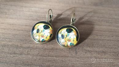 Orecchini, traversine. Colore. Klimt. Il bacio Gustav Klimt retrò dipinto giallo vintage. Idea regalo. Compleanno. Festa.
