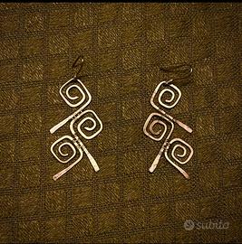 Orecchini artigianali in filo di ottone dorato rigido e battuto, caratterizzati da tre spirali geometriche sovrapposte legate tra loro con filo di ottone da 0,6 con tecnica wire wrapping.