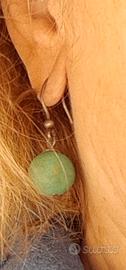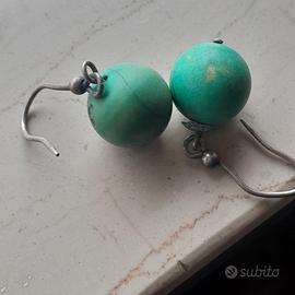 Orecchini con boule di vero turchese con amo in argento. Le boule hanno un diametro di circa 1,5 cm. Ad uno degli Orecchini manca il fiorellino di collegamento con l'amo come da foto. Le boule sono state prelevate da una collana di turchese lunga per ricavarne gli orecchini in pendant. Li vendo unicamente poiché sono diventata allergica all'argento.