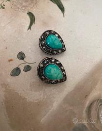 Meravigliosi orecchini a goccia in metallo argentato ( non sono sicura se sia argento o meno perché manca il marchio) tempestati di brillantini e pietra turchese centrale. Alta bigiotteria vintage che purtroppo non indosso perché hanno le clip senza buco. Sono davvero belli, é un peccato non sfoggiarli!