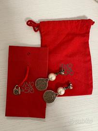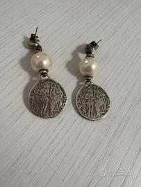 UNOde50 Orecchini originali in stile romano composti da tre pezzi: due perle a goccia allungate di diverse dimensioni e rifinite con una moneta antica placcata in argento