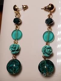0recchini curati nei particolari, nei toni del petrolio, turchese e oro. Materiali: vetro di Murano, resina e metallo dorato.