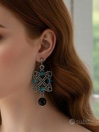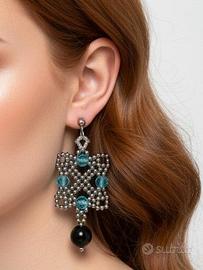 Questi orecchini artigianali, realizzati con la raffinata tecnica del bead weaving, catturano l'essenza dell'eleganza Art Decò degli anni Venti. Le minute Rocailles di ottone si intrecciano magistralmente con le rondelle di cristallo ceco finemente lavorato, creando un design sofisticato. La loro bellezza è ulteriormente impreziosita da luminose pietre di ossidiana nera, che aggiungono un tocco di mistero e raffinatezza.