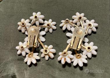 Si prega di notare che in uno degli orecchini manca un piccolo strass centrale su uno dei fiori (vedi foto ad alta risoluzione). Il difetto è minimo ma è stato incluso nella valutazione del prezzo per garantire la massima trasparenza. La bellezza complessiva del pezzo rimane inalterata e può essere indossato così com'è o restaurato.