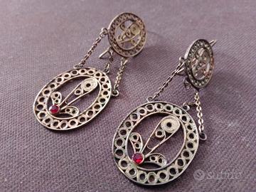 Coppia di orecchini in metallo filigranato dorato di inizio 1900, con catenelle, di fattezza all’antica, i due orecchini presentano una radice di rubino dal bel riverbero rosso. Lunghezza: 5,7 cm