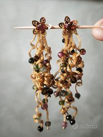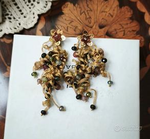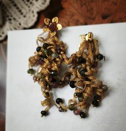 Splendidi orecchini pendenti vintage dal design scultoreo tipico degli anni '90 Pietro Balestra.ll Marchio Pietro Balestra (Laurum) è un brand nato alla fine degli anni '80, specializzato in gioielleria di alta qualità.È particolarmente noto per: • Oro Filato: Una tecnica brevettata (marchio registrato) che consiste nella lavorazione di sottilissimi fili d'oro intrecciati per creare gioielli flessibili e leggeri. Un pezzo unico che unisce l'eleganza dell'oro alla vivacità delle pietre naturali. Design: Raffinata lavorazione a intreccio dorato con perno a lobo a forma di fiore. Dettagli: Ricca cascata di pietre multicolore (tormaline/quarzi) che donano movimento e riflessi caldi. Stato: Ottime condizioni vintage, chiusura a perno sicura.