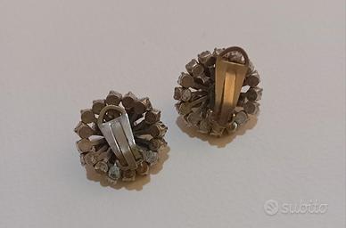 Orecchini vintage, degli anni '50/60, caratterizzati da cristalli rosa disposti a raggiera e chiusura a clip. Diametro 2,5cm.
