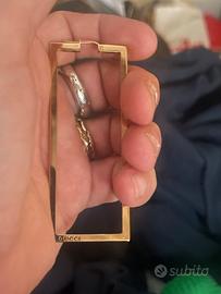 Orecchini Gucci rettangolare è realizzato in ottone con finitura color oro lucido, caratterizzato da una silhouette geometrica e incisione del logo