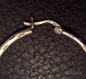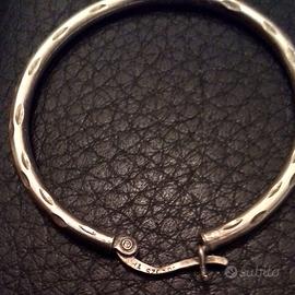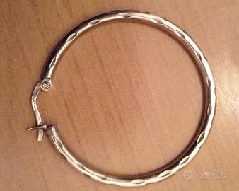 Orecchino singolo consistente in un cerchietto di argento timbrato 925, lavorato lungo tutta la circonferenza. Diametro di 4 cm.