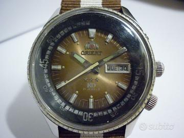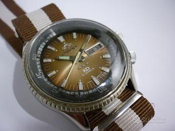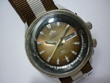 Orologio ORIENT KD anni'70, automatico day date. Quadrante marrone "occhio di tigre". Funziona perfettamente anche il datario e la lunetta. Doppio cinturino, il bracciale originale più nato in tono con i colori del quadrante. NON SCAMBIO. NON UTILIZZO tuttosubito . Pagamento con bonifico o ricarica postale. Info tramite la chat del sito. Guardate anche gli altri miei annunci.