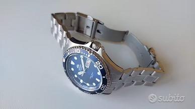 Vendo bellissimo Orient Ray II in ottime condizioni estetiche e funzionali. Orologio robusto e affidabile. Movimento automatico Orient calibro F6922 (carica manuale e hacking) Cassa in acciaio inox – diametro 41,5 mm Ghiera girevole unidirezionale blu Quadrante blu con indici e lancette luminescenti Giorno e data a ore 3 Impermeabilità: 200 metri (20 ATM) Vetro minerale, completo di scatola e manuale. Mio numero 3780820009.