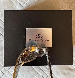 Vendo Orient Star RE-HJ0002L00B, orologio automatico di fascia alta appartenente alla collezione Contemporary Semi Skeleton di Orient Star. Quadrante blu navy profondo, apertura semi skeleton che rivela il cuore del movimento, e indicatore di riserva di carica a ore 12. 🔹 Caratteristiche principali: Movimento meccanico automatico calibro F7F62 (50 ore di riserva di carica) Quadrante blu navy con open heart e indicatori applicati lucidati a mano Cassa e bracciale in acciaio inossidabile lucidato a specchio Vetro zaffiro antigraffio con trattamento antiriflesso Fondello a vista con movimento decorato Impermeabilità 5 ATM (50 metri) Diametro cassa 41 mm