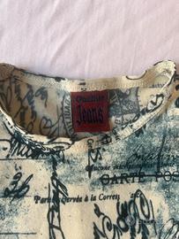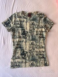 beautiful jean paul gaultier baby tee with blue postcard/letter print. thin, stretchy material and tight fit. short sleeves and print all-over, one inner and outer etiquette. small tear underneath the left armpit, can easily be resown; size xs. please dm me with questions or interest 💘