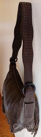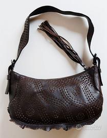Borsa è uguale avanti e dietro. Ugualmente impunturata con sottili fettuccine di camoscio cacao, con frangetta in pelle sui lati della base e su parte dei lati.