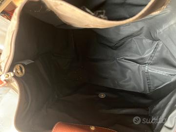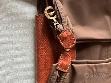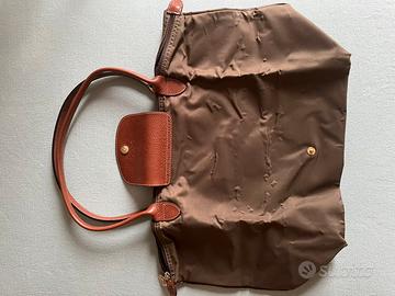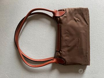 Originale borsa a spalla Longchamp Le Pliage in tela riciclata di colore marrone/camoscio con chiusura a cerniera e bottone a pressione. Borsa usata, presenta segni di utilizzo nel logo ( vedi foto ) che ha perso in alcuni punti la doratura e nei manici ( manici perfetti,ma come da foto, non sono perfettamente conformati nella forma originale ), ma è assolutamente in ottimo stato. Presente la consueta mini tasca interna piatta, l’interno è sfoderato e ancora in ottimo stato ( vedi foto ). Dimensioni : 45cm di lunghezza x 20cm di altezza ; altezza manico pari a 20 cm.