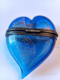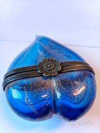per regalare un gioiello in modo originale, contenitore in vetro blu robusto a forma di cuore sabbiato con color oro, chiusura in metallo a forma di fiore dimensioni; 6,5 cm