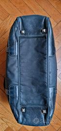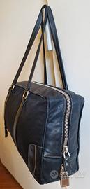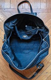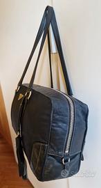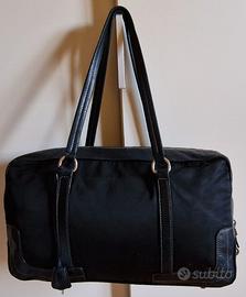 LEGGERE TUTTO IL MIO ANNUNCIO ! VEDI ALTRI MIEI ANNUNCI ! Raffinata borsa, originale PRADA. Ho acquistato borsa a Milano, c/o omonimo showroom in Via Montenapoleone. Pagata E 2100. Dentro sacca interna, vi è codice di autenticità. In vera pelle di vacchetta e re-nylon nera. Usata. In ottime condizioni. Su piattaforma di lusso on line, stessa borsa, nonostante rovinatissima e con buchi, é venduta al doppio mio. Borsa misura: Alta (con manici) 44 cm Alta (senza manici) 20 cm Larga 35 cm Profonda 11 cm Forma rettangolare. Su parte anteriore, borsa mostra logo Prada, su iconico triangolo metallico. Borsa è tutta bordata da pelle in vacchetta nera. Nella parte superiore, si chiude tramite cerniera di 60 cm, che inizia da lati dell’accessorio. Su parti frontali, ha due strisce centrali verticali in pelle, dai quali anelli argentati e logati Prada, partono 2 manici in pelle. Indossabile: a mano/braccio/spalla/tracolla Volendo, essendoci anelli argentati ai lati, si può aggiungere cinghia, per indossare borsa a tracolla. Borsa su un lato ha lucchetto argentato logato Prada e anche chiavette che penzolano coperte da pelle. I due manici della borsa, sono due fasce in pelle, larghe 1,6 cm, che poggiano su spalla perfettamente. Da uno dei manici, sporgono 2 deliziose fascette in pelle, al termine delle quali ci sono borchie argentate e delicatissime frange in pelle. Alla base della borsa figurano 4 piedini argentati, per evitare che essa si sciupi quando la si posa su superfici. Molto glamour ed elegante. Leggerissima da vuota e nel contempo molto capiente al suo interno. Internamente borsa è foderata in resistente tessuto nero, interamente logato Prada. Fodera interna è perfetta. Borsa mostra cerniera centrale di 25 cm, che chiude ampia sacca, usabile per riporre ulteriore roba. Nella parte centrale sotto cerniera, figura elegante targhetta rettangolare metallica, con inciso logo Prada. Ideale per donna che ama distinguersi sempre, ma con classe.