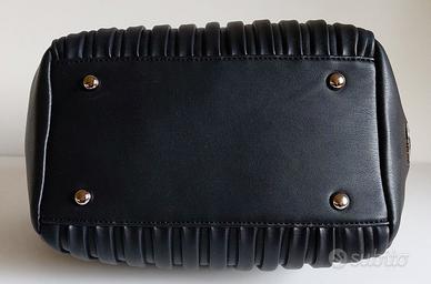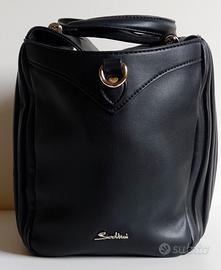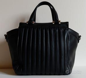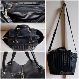 LEGGERE TUTTO IL MIO ANNUNCIO ! VEDI ALTRI MIEI ANNUNCI ! Raffinata borsa, originale SODINI. Sodini Bijoux, è una delle belle storie di successo italiane, iniziata nel 1967. Una avventura in costante crescita, costellata di apprezzamenti e conferme nazionali e internazionali, prima solo come leader italiano nel settore bijoux, e dal 2014 anche come brand di borse e prodotti esclusivi e unici, sempre frutto di ricerca, innovazione, gusto e design. Ho acquistato borsa a Forte dei Marmi, c/o rinomato showroom. Pagata E 210. Mai usata e intonsa. In morbidissimo pellame nero. Design molto sobrio e glamour. Borsa misura: Alta 36 cm (con manici) Alta 25 cm (senza manici) Larga 40 cm Profonda 11,5 cm Borsa è identica davanti e dietro. A forma trapezoidale, caratterizzata nella parte centrale da colonne verticali. Unica differenza è che su parte anteriore, compare fila verticale laterale di 7 cuoricini argentati, la quale regala a borsa aspetto molto raffinato. Indossabile: a spalla/mano/braccio/tracolla. Manici in pellame, larghi 2 cm, molto comodi e resistenti. Borsa possiede cinghia di pellame blu, lunga 134 cm, per indossare borsa a tracolla o spalla. Alla base sottostante, presenta 4 chiodini rotondi, per consentire ad accessorio di essere riposto su superfici, senza rovinarsi. Borsa su lato sinistro, evidenzia logo argentato Sodini. Su parte superiore della borsa, i manici partono, inseriti al centro di rullo argentato, il quale ai lati termina con dei mezzi cerchi, nei quali figurano dei cuori, all’interno dei quali è inciso logo Sodini. Nella parte superiore, si chiude tramite cerniera di 42 cm, che termina con raffinato gancio argentato, sul quale è inciso logo Sodini e sul quale inoltre é intagliato un cuore vuoto. Fodera perfetta, è in color nero, interamente logata Sodini. Dentro ha 2 tasche con cerniera (con gancio argentato, con inciso logo Sodini) di 17 e 20 cm, nelle quali riporre qualcosa + logo Sodini + 2 sacche profonde.
