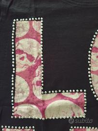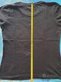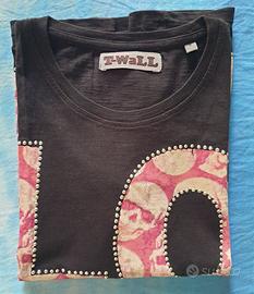 Bellissima T-shirt donna in cotone colore nero con stampa rosa e strass sul davanti