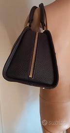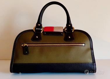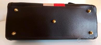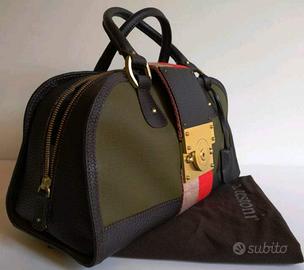 LEGGERE TUTTO IL MIO ANNUNCIO ! VEDI ALTRI MIEI ANNUNCI ! Raffinata borsa, originale A.TESTONI. Ho acquistato borsa a Milano, c/o omonimo showroom in via Montenapoleone. Pagata E 2.800. In vera pelle marrone, con parti in tessuto cerato e con dettagli in nastro Web. Borsa è tutta in vera pelle. In parte marrone. Nella parte centrale anteriore e posteriore in pellame cerato in color verde militare e banda centrale in nastro Web, colore rosso ed ecru. Design molto sobrio e glamour. Mai usata. Intonsa. Regalabile. Provvista del suo dust bag. Indossabile: a spalla/mano/braccio/tracolla. Essendoci cerchi, si può usare a tracolla, aggiungendo una cinghia. Borsa misura: Alta 31 cm (con manici) Alta 17 cm (senza manici) Larga 33 cm Profonda 14 cm Borsa a suoi bordi è tutta impunturata, la qual cosa la rende più resistente e importante. Da parte anteriore della borsa, dopo fascia alta 2 cm in pelle marrone, inizia banda in nastro Web rosso ed ecrù, che è visibile per 6,5 cm, coprendo parte centrale e superiore della borsa. Borsa nella sua parte verticale centrale, subito dopo nastro Web rosso ed ecrù, è caratterizzata da banda in pelle marrone di cm 7,5, che termina con banda metallica dorata satinata, su quale è inciso logo a.Testoni femme. Dopo banda metallica dorata satinata, su quale è inciso logo a.Testoni, ricomincia per altri 6,5 cm banda in nastro Web rosso ed ecrù. Questo gioco di differenti materiali e colori, nella parte verticale e centrale della borsa, le regala originalità, luminosità e pregio. Manici si agganciano a raffinati intarsi in pelle marrone, tramite resistenti cerchi piatti e dorati satinati, sui quali é inciso logo a.Testoni. Manici rigidi e tubolari in pelle marrone, molto resistenti e comodi ad indosso. Internamente borsa è foderata in color rosa tenue. Fodera interamente è intonsa e logata a.Testoni. Borsa ha cerniera centrale di 20 cm, per accedere a sacca per riporre effetti personali. Dentro targhetta di a.Testoni.