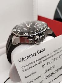 Cassa in Acciaio inossidabile diametro 43,5x43,5 - spessore12.6mm - movimento a carica automatica Calibro Oris 733, base SW 200-1, con rotore rosso, batte a 28.800 vph, - riserva di carica di circa 38 ore - Impermeabilitàa 30 atm/300 mt - vetro zaffiro - lunetta in ceramica lucida - colore quadrante nero lucido – Lancette ed Indici luminosi - Lancetta centrale dei secondi con cerchio luminoso - Visualizzazione della data a ore 6 - cinturino gomma originale con chiusura deployante