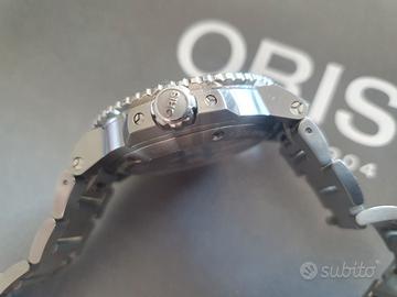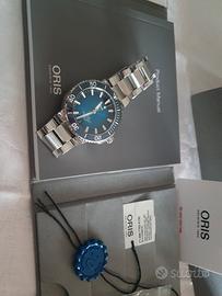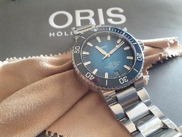ORIS Aquis Calibre 400-2 Full Set Garanzia Fino al 2031. Diver Oris Aquis 43,5 mm calibre 400-2 di manifattura con 5 giorni (120 ore di riserva di carica). Si tratta dell'evoluzione del calibro 400 che apporta delle migliorie alla prima versione. Full set (scatola, controscatola, libretti, card di garanzia, maglie di riserva del bracciale, Tag con referenze e tag di garanzia 10 anni). Orologio in condizioni ottime. Quadrante blu. Lunetta in ceramica. Vetro zaffiro. Fondello a vista con vetro zaffiro. Impermeabilità 300 metri assicurati dal fondello e dalla corona a vite. Bracciale con estensione per la muta e perni a vite, clasp con doppia chiusura di sicurezza e microregolazioni. Il bracciale è dotato di sgancio rapido. Il calibro è lo spettacolare 400-2 di manifattura con ben 5 giorni di riserva di carica. La garanzia è valida fino ad agosto 2031. L'attuale prezzo di listino è di euro 3700. Valuto eventuali permute parziali con conguaglio o scambio con orologi automatici recenti e full set di massimo 39mm di diametro tipo Longines, Rado, Tag Heuer, Tudor, Vulcain