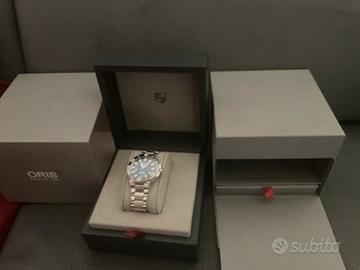 Orologio Oris Aquis date, anno 2025 referenza 0173377664135, condizioni pari al nuovo, dispone anche del cinturino originale in caucciù con kit per smontaggio cinturino. Colore del quadrante blu profondo con meravigliosi riflessi. Il costo complessivo di tutto se comprato nuovo, e’ di circa 2600 euro.
