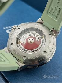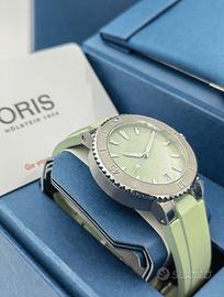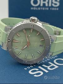 Oris - Aquis Date - Mother of Pearl Automatico – 36,5 mm – Quadrante in madreperla.Marca: Oris Modello: Aquis Date Dimensione cassa: 36,50 mm Materiale cassa: Cassa in acciaio inossidabile multi-pezzo Bezel: Anello superiore con scala dei minuti Resistenza all’acqua: 30 bar / 300 metri Vetro: Vetro zaffiro convesso con rivestimento antiriflesso all’interno Fondello: Fondello in acciaio inox a vite con finestra display in vetro minerale trasparente Quadrante: Quadrante madreperla verde mare con indici ora luminescenti Corona e cinturino: Cinturino in gomma originale Oris Interhorn Width: 18 mm . Calibro: Oris 733-1 Tipo: Movimento meccanico automatico Autonomia: Circa 41 ore Frequenza: 28.800 alternanze all’ora (4 Hz) Viti: 26 Funzioni: Ore, minuti, secondi, data Caratteristiche: Data istantanea, fermo-secondi, Condizioni L’orologio è nuovo e presentato in ottime condizioni. La consegna comprende il set completo: - Scatola di presentazione originale Oris - Scheda di garanzia originale - Documentazione