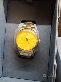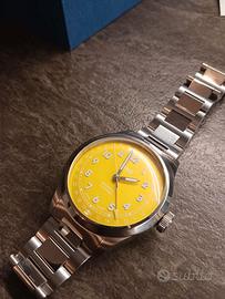 Orologio automatico svizzero, quadrante giallo Cassa 40mm, lunetta liscia, corona a vite, impermeabile 50m Bracciale acciaio originale chiusura a farfalla finali pieni, ansa 20mm Everyday watch molto leggero e portabile Full set, ottimamente tenuto Spedisco solo dopo bonifico, no tuttosubito Valuto scambi o permute (solo avere) Seiko Citizen Hamilton Glycine Tissot Casio automatico No vintage no quarzo