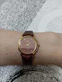 Quadrante marrone e lancette e numeri dorati.