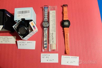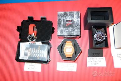 Cominciando da destra vs sinistra: CASIO W 218 H pari al nuovo Euro 20; SWATCH GP109 con scatola 1994 ottimo Euro 50; SKMEI nuovo Euro 10; CASIO 3224 W218H nuovo Euro 29; CASIO AW2747 AW-80 nuovo Euro 55; CORGEUT DAY DATE autom. nuovo Euro 60; AVIATOR AVW1931G253 nuovo Euro 60; CASIO misuratore di maree RT-4ER GLX 5600 nuovo 70 euro; ADDISDIVE doppio cinturino autom. nuovo Euro 59. No perditempo, altre foto a richiesta con numero whatsapp per l'invio.