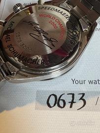 Orologio di produzione attuale; dedicato a Michael Schumacher, world Champion 2000, serie limitata di 6000 pezzi cassa in acciaio; lunetta in acciaio con serigrafia nera; vetro in plastica; quadrante nero; fondello in acciaio con firma di Michael Schumacher (vedi foto) e dedica alla world champion 2000; bracciale in acciaio; dimensioni di cassa: diametro 39 mm, spessore 12 mm; movimento meccanico a carica automatica con funzione cronografo, calibro 3220; corredato di scatola originale dedicata;