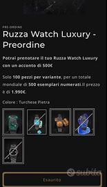Vendo Ruzza Luxury Watch edizione limitata soli 100 esemplari in tutto il mondo. Ruzza Watch Luxury totalmente in carbonio forgiato, con quadrante in vera pietra naturale: Diametro cassa 40mm, movimento automatico Sellita SW200. Made in SWISS. Orologio molto Raro. Prezzo richiesto 2.700€