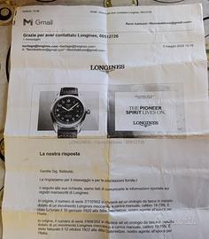 OROLOGIO A CIPOLLA DEL 1920 MECCANICO A CARICA MANUALE CALIBRO 19.75N E IN ALLEGATO E-MAIL DI RISPOSTA DALLA LONGINES SULL'UFFICIALITA' DELL'OROLOGIO.