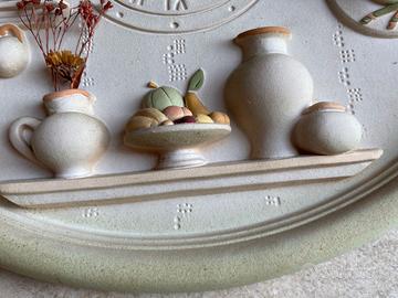 Orologio a parete in ceramica (31 x 25 cm) con soggetti in rilievo, colori pastello, perfettamente funzionante con pila stilo sul retro. Raffinato e dal design intramontabile (benchè di fattura ultratrentennale).