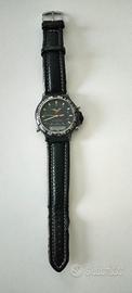 Vendo orologio anni '90 Aeronautica Militare dedicato al 32° Stormo quando era di stanza a Brindisi, movimento al quarzo swiss made doppio formato analogico/digitale, cassa in acciaio marchiata North Eagles, cinturino in pelle non coevo marca Morellato. Il movimento analogico funziona benissimo, quello digitale invece a volte fa le bizze e lampeggia da solo sfalsando l'orario; in sostanza andrebbe regolato non appena sostituita la pila e poi andrebbe evitato di rimetterci mano. L'orologio viene venduto con la formula "visto e piaciuto" e preferirei consegna a mano