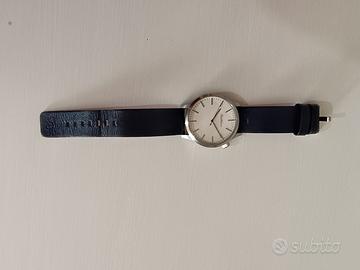 Cinturino in pelle blu con parte interna arancio, fibbia metallo , anse da 22.