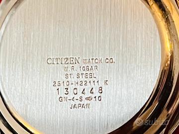 Vendo orologio al quarzo Citizen WR100. Braccialato come da foto, usato pochissime volte. Batteria nuova, appena sostituita. A corredo: Scatola esterna, scatola interna in legno entrambi originali Citizen e certificato di garanzia con timbro del rivenditore. Bracciale regolabile per polsi fino a 18-18,5cm.