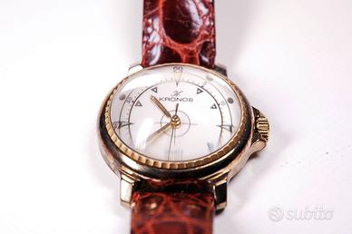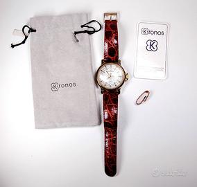 Orologio al quarzo Kronos Palomar, movimento meccanico, cassa in acciaio colore oro giallo con leggere tracce di ossidazione sul lato, quadrante bianco con vetro bombato a lente molto particolare, cinturino pelle marrone con passantino da incollare. Con busta originale. Diametro cassa 40,5 mm, spessore 19 mm. Swiss Made. Fermo da anni. Prezzo richiesto 40,00 euro.