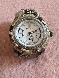 Orologio al quarzo originale Glam Rock in pelle di pitone. Mai usato. Batteria da inserire. Analogico, con cronografo. resistente all'acqua 10 atmosfere, cassa in acciaio inox spessore 12mm, diametro 46 mm, peso 110 g, quadrante bianco, cinturino in pelle di pitone.