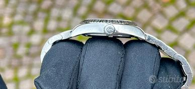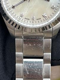 Tipico Philip Watch Caribbean da donna nella versione con movimento al quarzo Svizzero. Cassa in acciaio da 31mm, quadrante madreperla con diamantini sugli indici. Corona marchiata a vite cosi come il fondello.