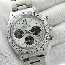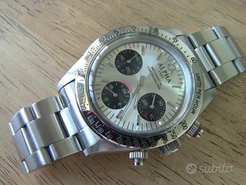 Alpha Watch cronografo meccanico , carica manuale, corona, pulsanti, fondello avvitati, Movim. Seagull, ricevuti in regalo, mai utilizz. riduzione collezione, cust. da viaggio, card Alpha, no permute , non spedisco. 300 eur. cad.( legger. trattab.) Disp. Dial Black / Silver, Disponibile anche Silver Fondello Close Polsato mint condition. 250 eur.