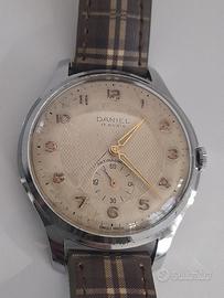 orologio vintage anni 60 daniel swiss made in ottime condizzioni cassa perfettamente cromata da 37 mm. corona, vetro e cinturino in pelle nuovi , il movimento a carica manuale è stato revisionato di recente, molto bello il quadrante con lavorazione a nido d' api e indici applicati in oro.