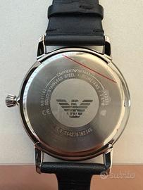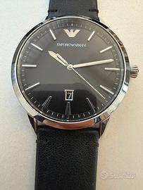 Orologio Armani a tre lancette con datario al 6 e cinturino in pelle nera. NUOVO CON ETICHETTE E PELLICOLE (Causa doppio regalo) Con scatola, libretti e garanzia in validità. Ottima idea regalo, ancora con busta del negozio. Codice Articolo AR11193t