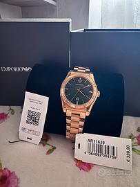 Orologio Armani da donna indossato solo due settimane, ovviamente come nuovo. Con certificato di autenticità e QR code. Il Quadrante in un bellissimo ed elegante colore verde misura 32 mm, colore rosa in acciaio inox, chiusura a fermaglio, movimento al quarzo. Spedisco e ricevo pagamenti con PayPal o bonifico bancario, no poste pay.