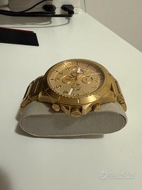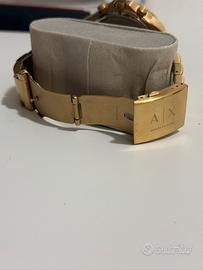 Nuovissimo e mai usato orologio Armani Exchange Chrono al quarzo con bracciale a maglie piene, ghiera unidirezionale a 120 scatti. Colore Oro.