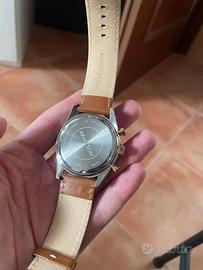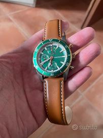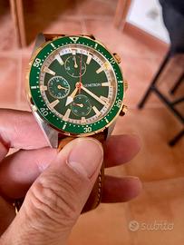 Perfetto stato pari al nuovo modello Lloyd 42mm vetro minerale cassa acciaio inox satinato quadrante colore verde smeraldo oro e bianco cinturino vera pelle marrone movimento al quarzo con 3 sottoquadranti giorni settimana e anno veramente originale e bello.