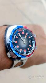 orologio originale Aurore super calendar 17 rubis jewel's Vintage skin Diver subacqueo anni 70 con Movimento meccanico a carica manuale. Cinturino vintage in acciaio rally in buono stato. L'orologio è in buone condizioni visto l'età, la corona di carica è in buono stato. La cassa in acciaio originale è da 42 mm senza contare la corona, Tutti i difetti estetici sono visibili in foto, vetro sano ma con qualche graffio leggero. Orologio ha una riserva di carica ottimale di circa 40 ore, L'orologio non si blocca, provato nel porta orologi e al polso ed è fluido e preciso.