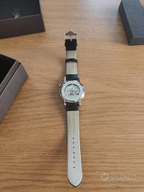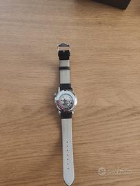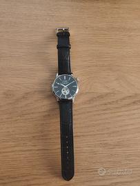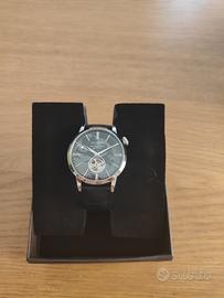 orologio da uomo, movimento automatico 21 rubini giapponese calibro miyota 82s0 con bilancere oscillante a vista, cassa in acciaio 316l del diametro di 41 mm. impermeabile 5 atm. fondello a vite con oblo' a vista sulla meccanica. vetro minerale con trattamento protettivo zaffiro. quadrante nero in smalto, indici e logo applicati. cinturino nero in vera pelle stampa coccodrillo