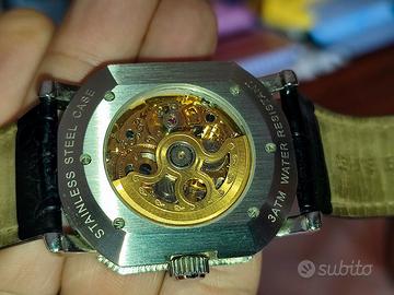 Vendo splendido orologio automatico con quadrante scheletrato e movimento automatico, l'orologio ha solo il cinturino un po' usurato per il resto è perfetto e perfettamente funzionante, di seguito le caratteristiche: Cinturino in pelle nera con cuciture bianche Quadrante nero e oro con datario, 45 x 38 mm Lunghezza quadrante e cinturino: 22 cm Larghezza cinturino: 23 mm Spessore quadrante: 10 mm Fondello inciso Cassa in acciaio inox argentato Peso: 88 g Resistente all'acqua Movimento automatico di alta precisione a batteria Visualizzazione di data, mese e giorno della settimana Fondello trasparente in acciaio inox Stile: Orologio elegante da uomo Per qualunque domanda contattatemi